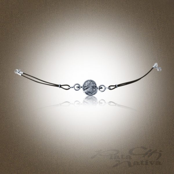 Pulsera moneda Íbera: La original representa a Kastilo y corresponde a una emisión anterior a los años 214-212 a.c. En el anverso se observa la cabeza que lleva una diadema con ínfulas y por el reverso un toro parado, encima del mismo una luna creciente.